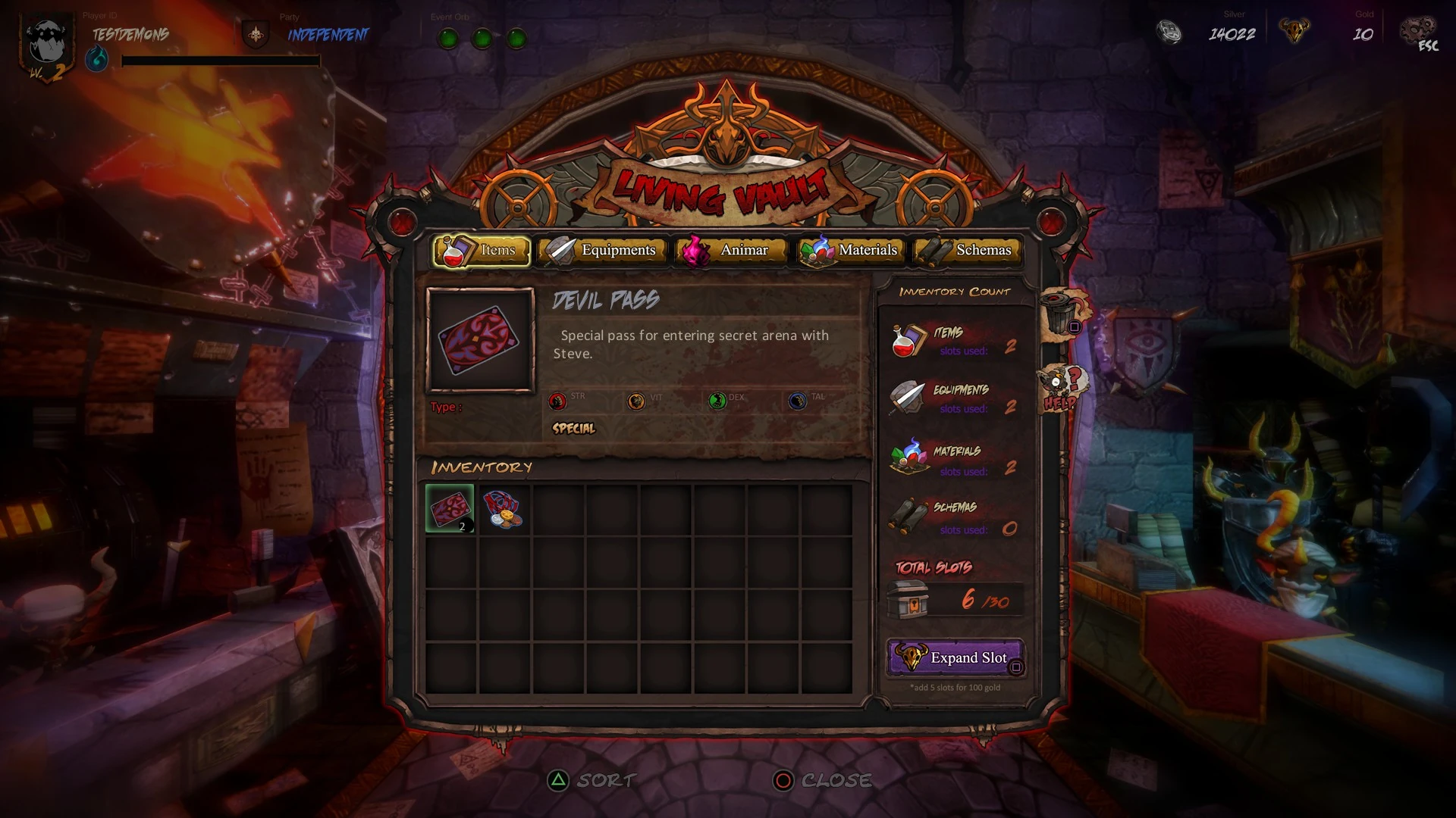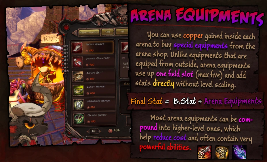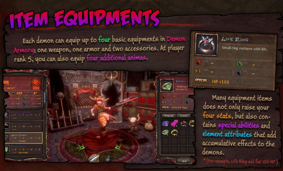 - Equipment Item are Weapon, Armor, Accessory, Trinket, and Pet are demon's equipable item. (see Equip Window.)