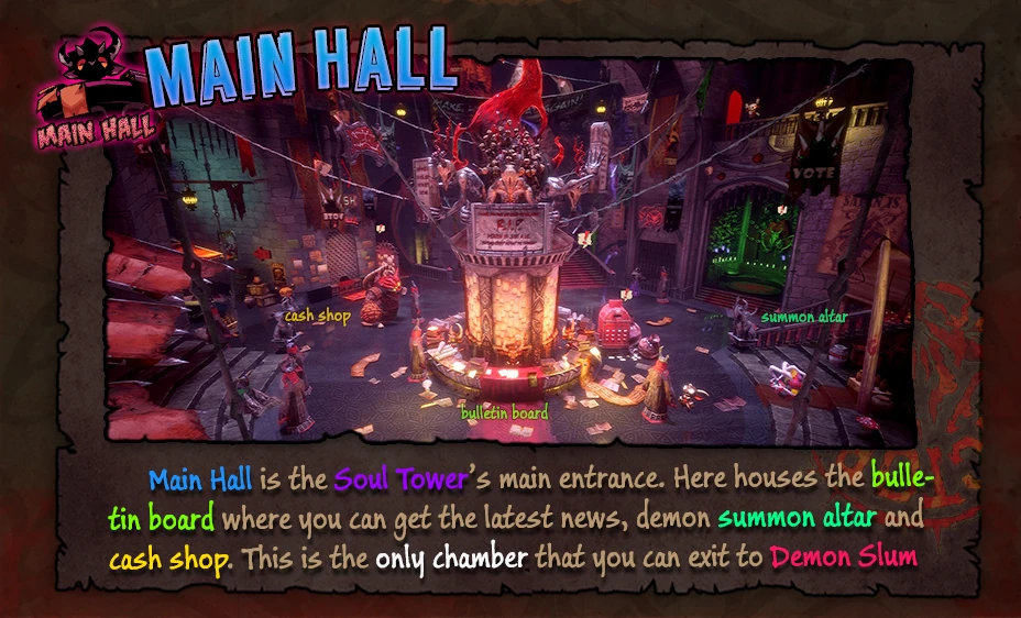 Main Hall is the Soul Tower 's main entrance. Here houses the Bulletin Board where you can get the latest news, demon Summon Altar and Cash Shop this is the only chamber that you can exit to Demon Slum.
